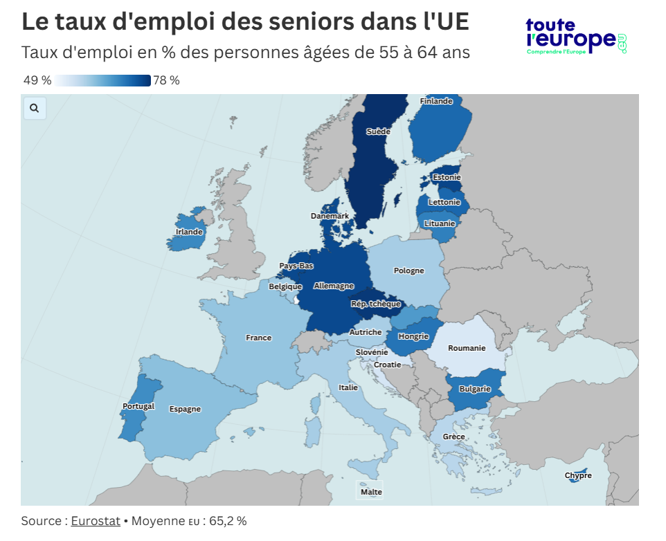 L’emploi des seniors progresse régulièrement dans l’Union européenne. Le taux d’emploi des 55-64 ans atteint 65,2 % en 2024 (dernières données disponibles, tendance stable en 2025), contre 63 % en 2023.